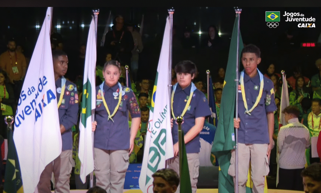 Os Escoteiros do Distrito Federal tiveram a honra de participar da abertura conduzindo as quatro bandeiras nobres do evento: a dos Jogos da Juventude, do Comitê Olímpico do Brasil (COB), do Distrito Federal e a do Brasil. 🇧🇷✨